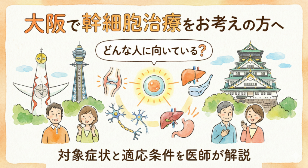 大阪の再生医療クリニック「CELL GRAND CLINIC」は、自己脂肪由来幹細胞治療・幹細胞培養上清液(エクソソーム)など、医学的根拠に基づく最先端医療を提供します。 米国再生医療学会専門医の高度な経験と知見、そして国内最高レベルの細胞培養技術を融合。 厚生労働省受理の提供計画数は第2種・第3種あわせて13の認可を持ち、「糖尿病・変形性膝関節症・慢性疼痛」といった疾患治療から、「癌予防・アンチエイジング(フレイル)・美容・加齢疾患(AGA,ED)」まで。完全プライベートな個室で患者様一人ひとりの症状に合わせたオーダーメイドの再生医療プランをご提案します。