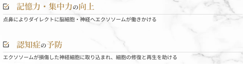 研究では、マウスモデルにエクソソームを点鼻投与することで、学習能力や空間記憶が改善したという報告もあります。