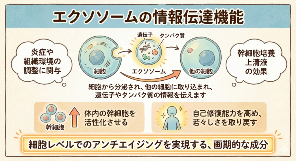 この情報伝達により、炎症や組織環境の調整に関与することが示唆されています。エクソソームは、幹細胞培養上清液の効果を発揮する上で、中心的な役割を担っているのです。