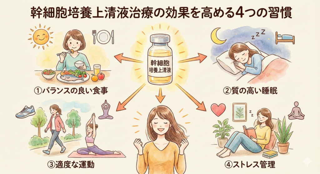 幹細胞培養上清液治療は、体の再生能力を高める治療ですが、生活習慣が乱れていると、その効果も十分に発揮されません。以下のポイントを意識して、治療効果を高めましょう。