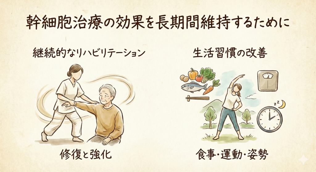 適切なリハビリの継続、生活習慣の改善、定期的な経過観察が重要です。必要に応じて、6〜18ヶ月ごとに幹細胞培養上清液やエクソソームの追加投与を行うことで、効果をさらに延長できます。