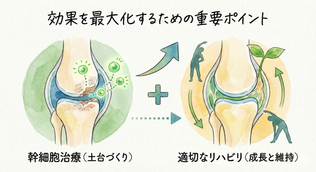 リハビリテーションの継続が最も重要です。幹細胞治療で組織が修復されても、それが以前より強い組織になるわけではありません。日常生活の動作や体の使い方のクセがあると、再びダメージが蓄積してしまう可能性があります。