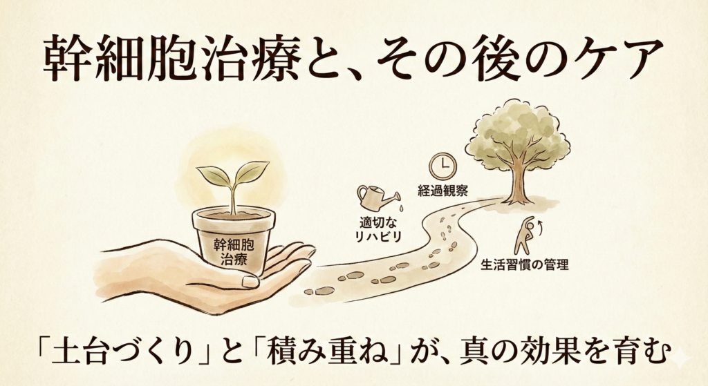 幹細胞治療は「土台づくり」であり、その上に適切なリハビリを積み重ねることで、真の効果が発揮されます。