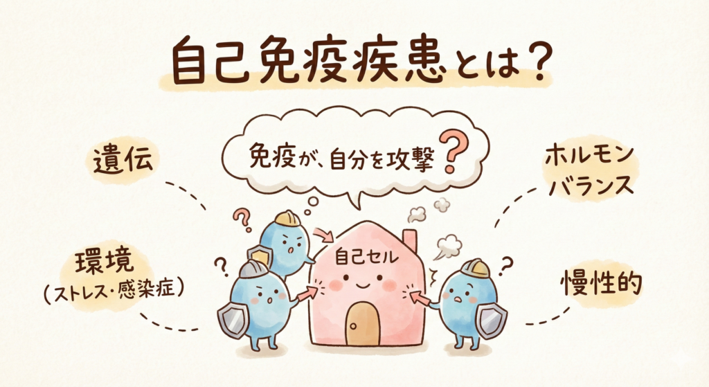 自己免疫疾患がなぜ起きるのか、まだ明確には解明されていませんが、遺伝的要因、環境要因(感染症や生活習慣、ストレス)、ホルモンバランスの変化などが関係していると考えられています。これら複数の要因が絡み合うことで、免疫システムに誤作動が生じ、自己免疫疾患が発症すると推測されています。