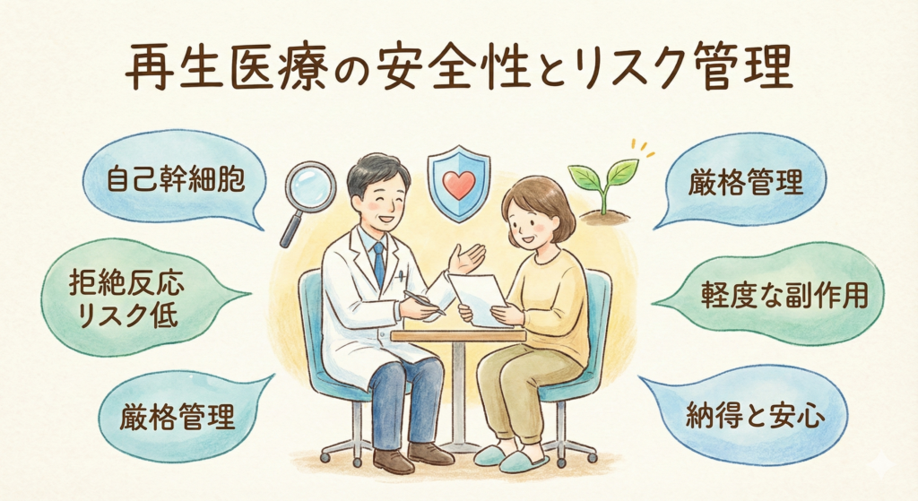 再生医療を受けるにあたって、患者さんが不安に感じることの一つに、安全性やリスクに関することがあるかもしれません。再生医療は自己の幹細胞を用いるため、他人由来の細胞を使う場合と比較して拒絶反応や重篤な副作用のリスクは極めて低いとされています。