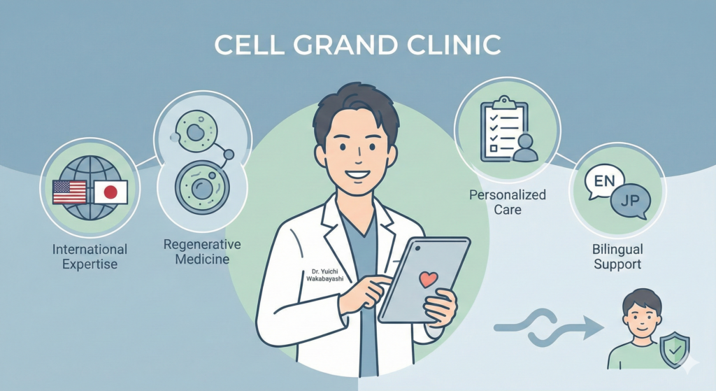 Cell Grand Clinic is directed by Dr. Yuichi Wakabayashi, a Diplomate of the American Board of Regenerative Medicine with research experience at the U.S. National Institutes of Health (NIH). Dr. Wakabayashi combines Japanese precision medicine with international clinical standards, offering every patient a thorough, personalized treatment plan. Bilingual consultations are available in English and Japanese, ensuring clear communication throughout your treatment journey.
