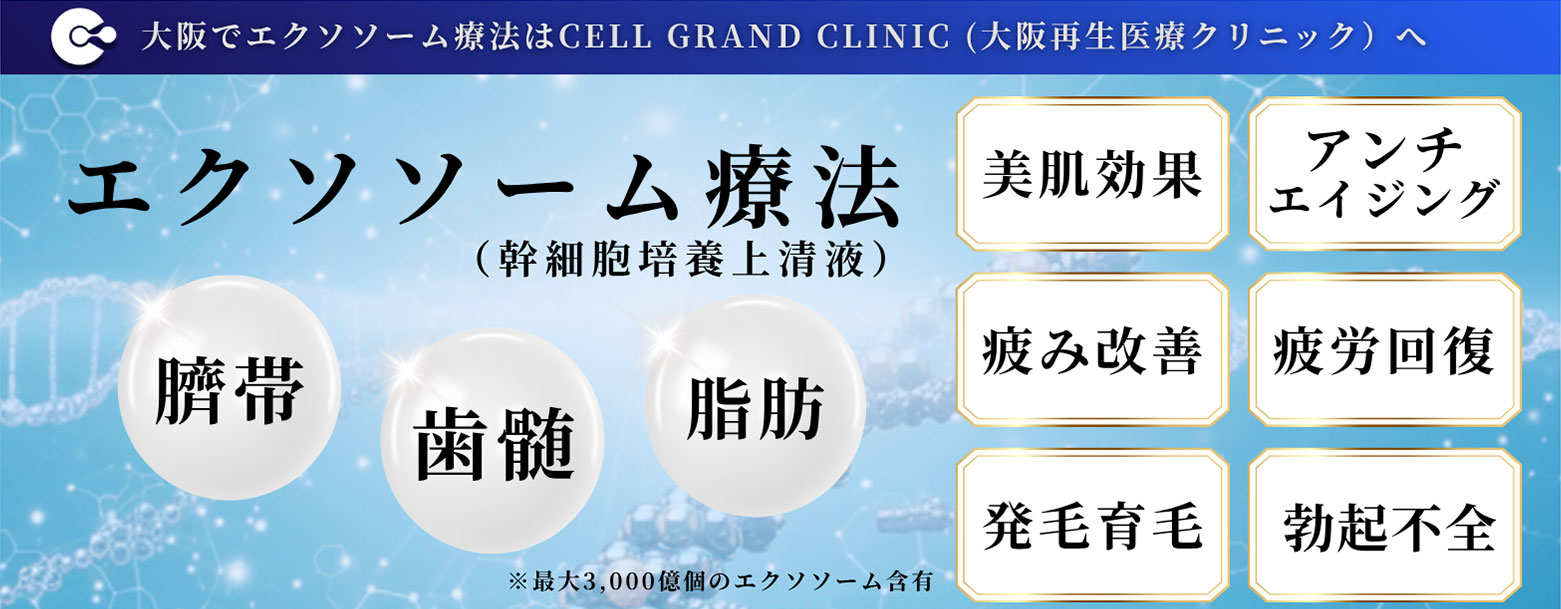 エクソソーム治療なら大阪再生医療クリニックへ。若い幹細胞由来の上清液を用い、細胞レベルで老化や疲労、薄毛、ED、美肌などを改善へ導きます。安全性と効果を追求した再生医療で、健康と若さを内側からサポートします。